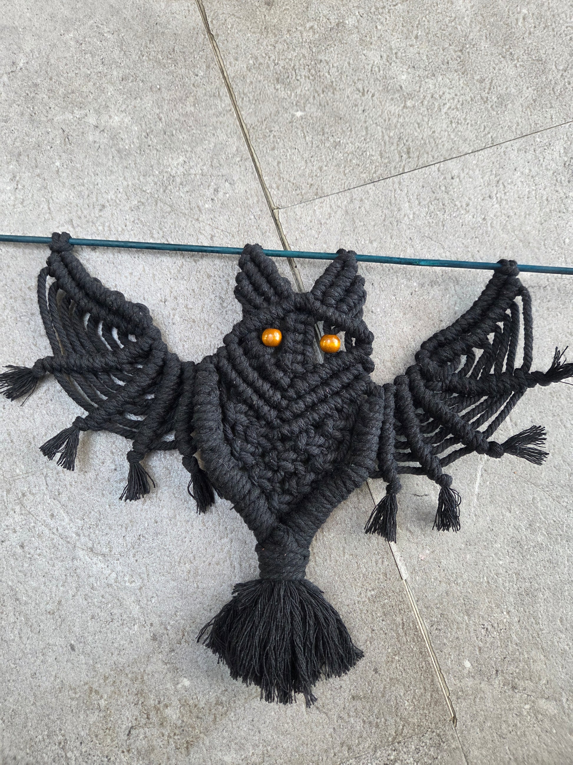 Cute yet spooky, Handcrafted Macrame bat wall hanging. Made with Cotton cord and finished with wooden beads for eyes.