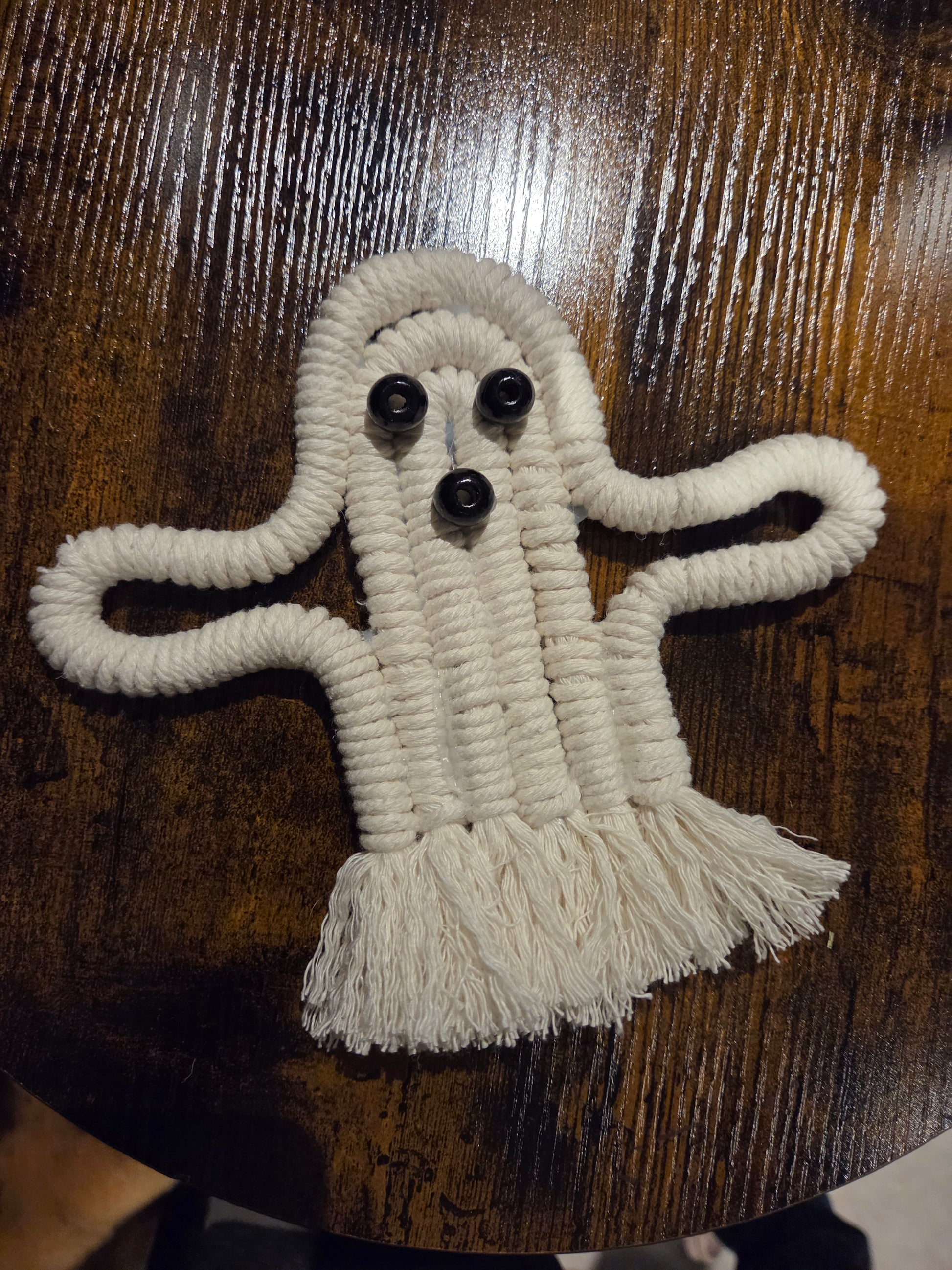 Handmade Halloween Decor. This spooky-cute ghost is handcrafted with natural cord, wire and finished with bead eyes and mouth, giving him a little personality.