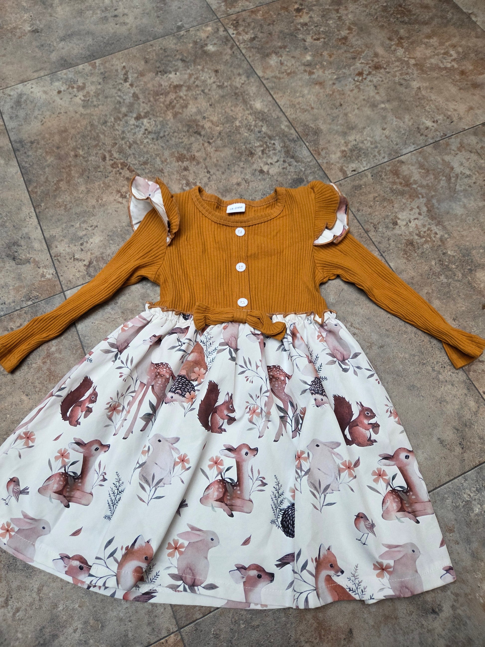 Kids mustard, woodland themed dress, with shoulder frill detail
